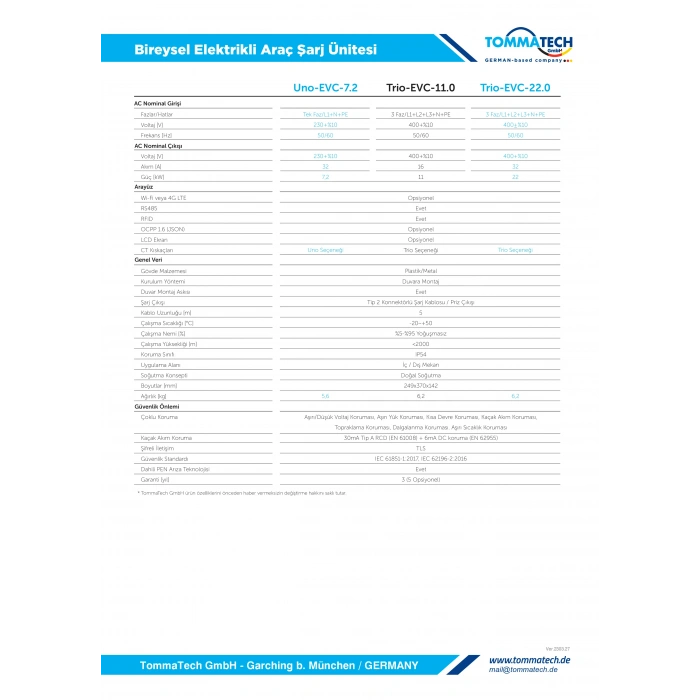 TommaTech (EVC) Araç Şarj Cihazları, Tip II konektörler aracılığıyla Ekonomik Mod, Hızlı Şarj Modu veya Özel Mod’da farklı şarj standartlarına sahip elektrikli araçların hızlı ve kolay bir şekilde şarj edilmesini sağlar. Akıllı ve kompakt bir tasarıma sahip (EVC) araç şarj cihazları, iç ve dış mekan uygulamalarında kullanılabilir ve aynı zamanda geniş çalışma sıcaklık aralığına sahiptir. Bu da TommaTech (EVC) Araç Şarj Cihazlarını konut, ofis veya kamu uygulamaları için tercih edilen seçenek haline getirir. Ek olarak, TommaTech Trio ve Uno Hibrit İnvertörler ile tam uyumluluğa sahip araç şarj cihazları, lityum batarya uygulamalarıyla birlikte güneş enerjisinden en yüksek biçimde yararlanılmasını mümkün hale getirir.